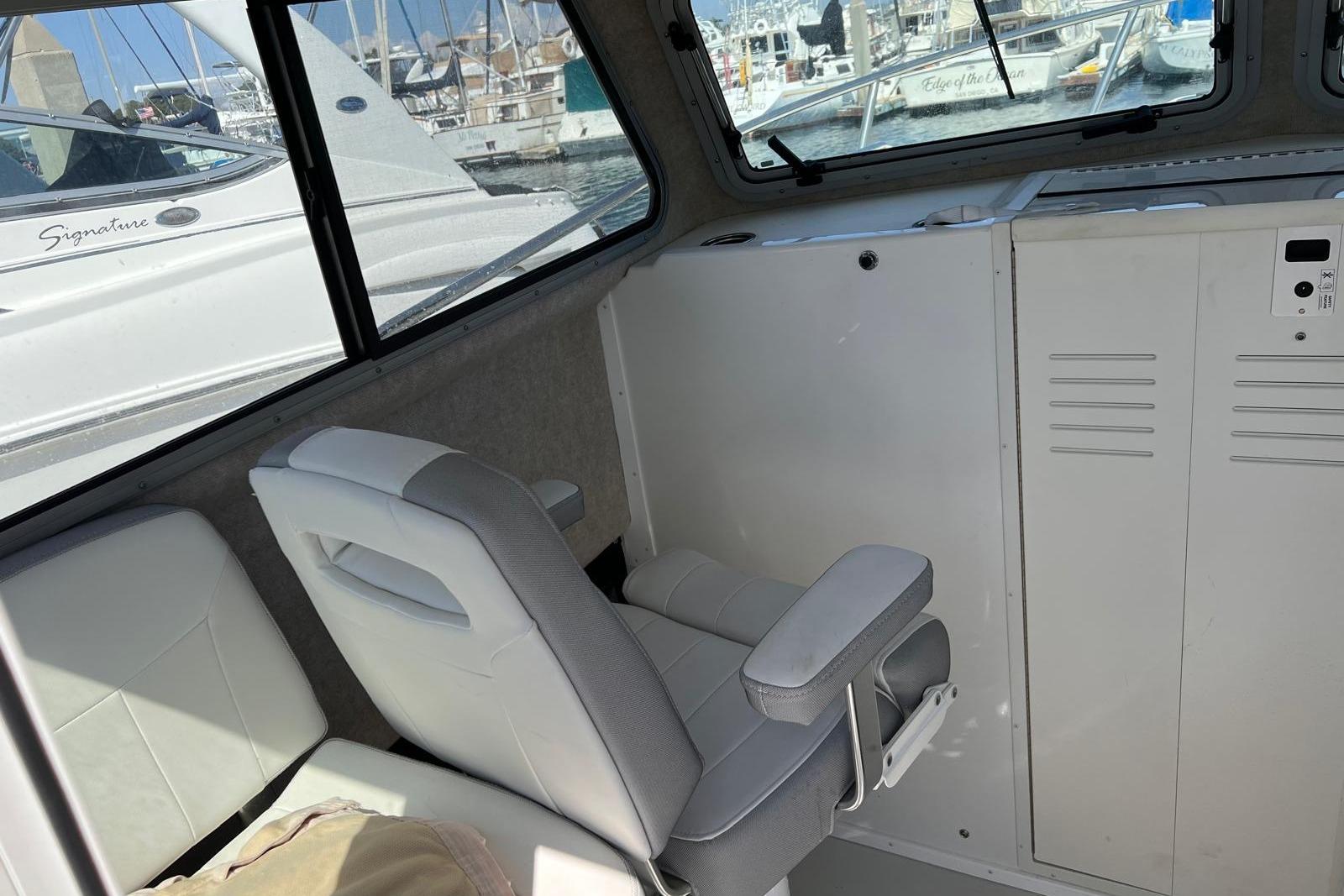 Pilothouse (59"Length, 82"Width,76" Headroom): Tinted windshields Port and Starboard opening front windows, Port and Starboard opening windows with screens with anodized aluminum frames, headliner, overhead lighting, ladder back chairs with cushions and, Port and Starboard aft companion seats with interior storage; non-skid pilothouse floor, grabrails on aft bulkhead, cup holders (2)