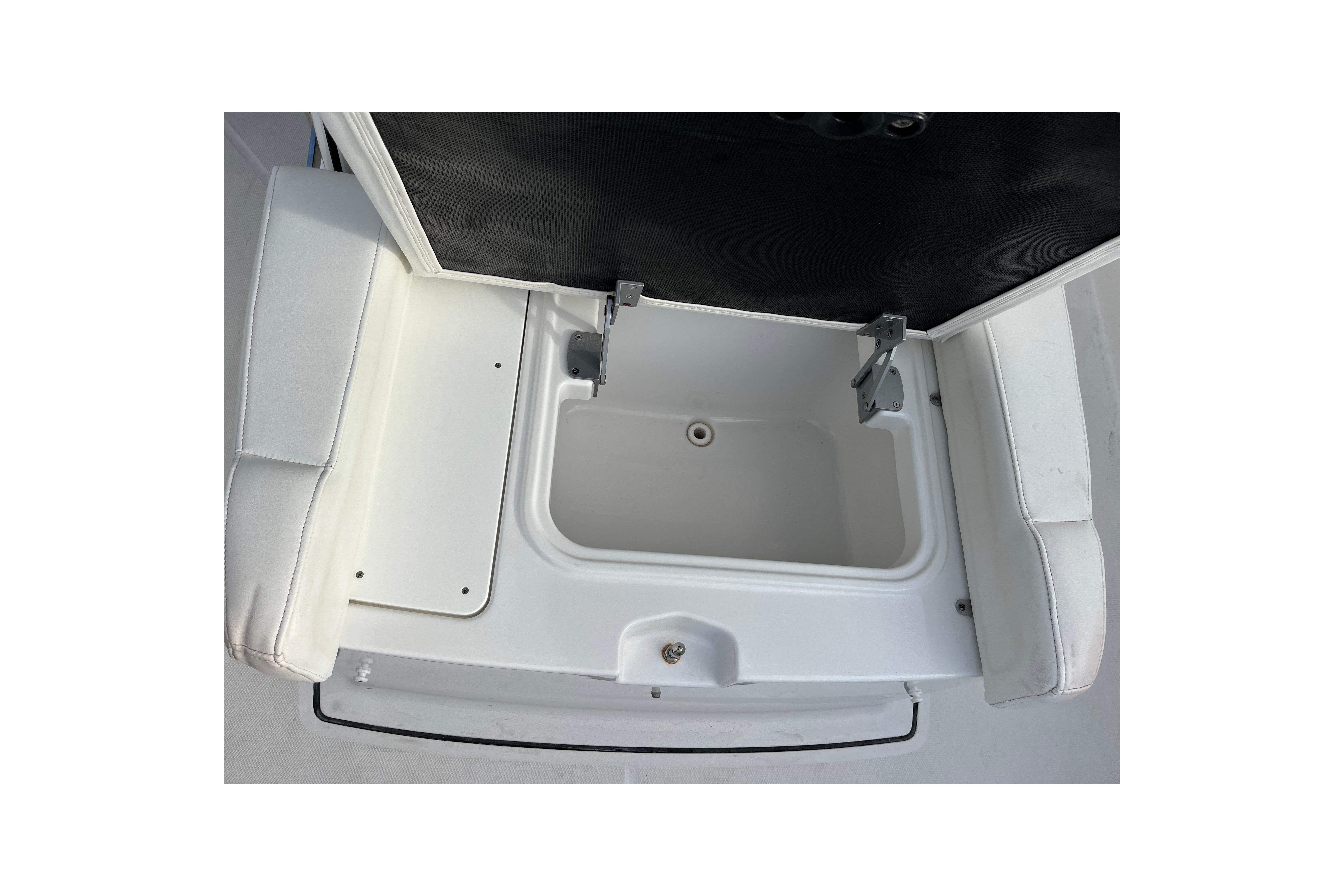 - Leaning Post, Fiberglass w/ Helm Seats & Flip-up bolsters, Pull-out/removeable 45QT Yeti Tundra Cooler, sink w/fresh water pull-out sprayer, bait prep station w/cutting board, drink holders, storage drawers (2), and slide-out tackle utility boxes (4)